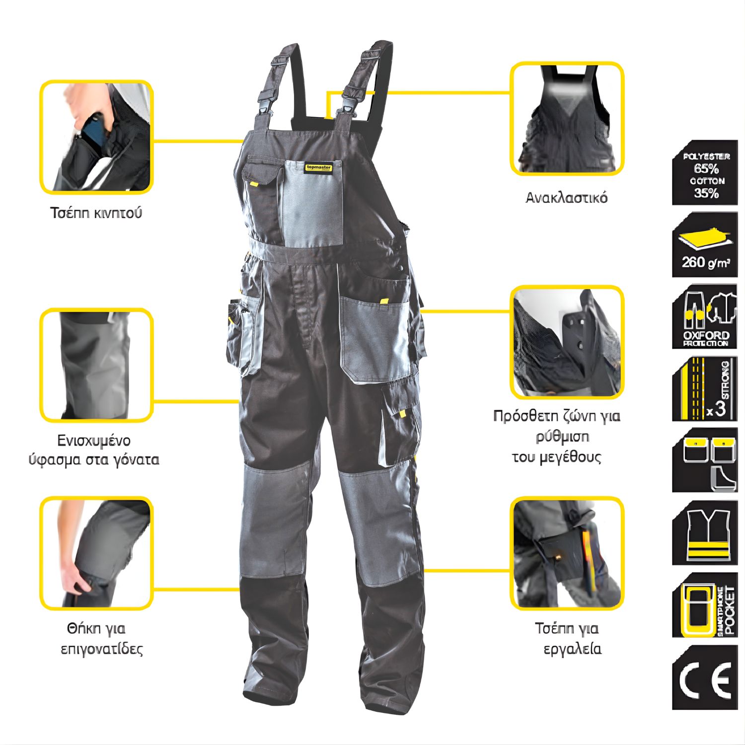 Η τιράντα φόρμα Top Master σε μέγεθος XXXXL είναι κατασκευασμένη από υψηλής ποιότητας υλικό, με το 65% πολυεστέρα και το 35% βαμβάκι για ανθεκτικότητα και άνεση. Η μαύρη απόχρωση προσδίδει επαγγελματική εμφάνιση, ενώ η ειδική σχεδίαση με τιράντες εξασφαλίζει ελευθερία κινήσεων.